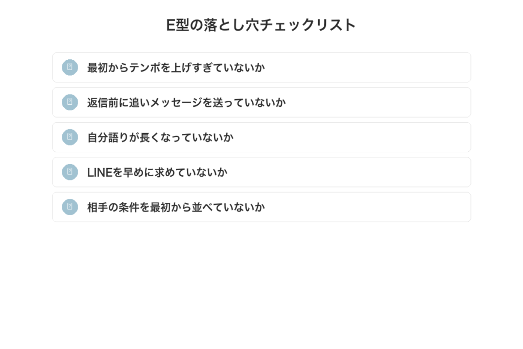✅ E型の落とし穴は「テンポ先行」「自分語り」「LINE早期誘導」の3つ